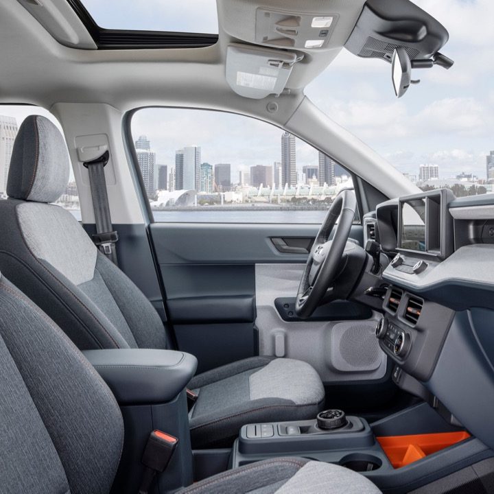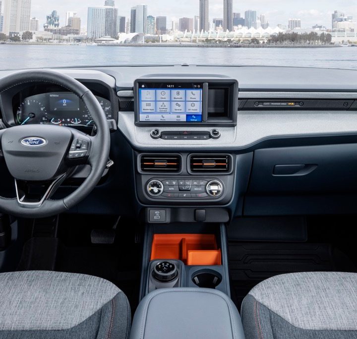La cabina de la Maverick es un lugar que ni siquiera con el paquete “de lujo” se siente especialmente suntuosa, pero la hace un mejor vehículo. El equipo de diseño tomó la cada vez más popular aproximación de sinceridad en los materiales, donde los plásticos no fingen ser cuero o tener costuras, y no hay ni maderas ni metales falsos. El resultado es un espacio que se siente novedoso y agradable.