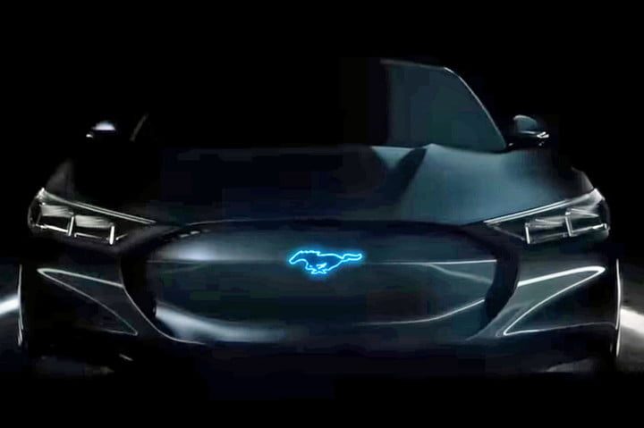 El anuncio muestra brevemente las imágenes de un Mustang 2019 que recorre una desértica carretera y luego una animación de su motor V8 de 5.0 litros en acción. La siguiente escena presenta un modelo inédito. Parece un Mustang, pero en vez de rejilla tiene un panel del color de la carrocería con un emblema luminoso.