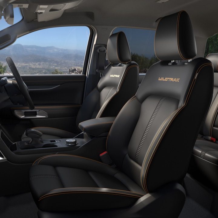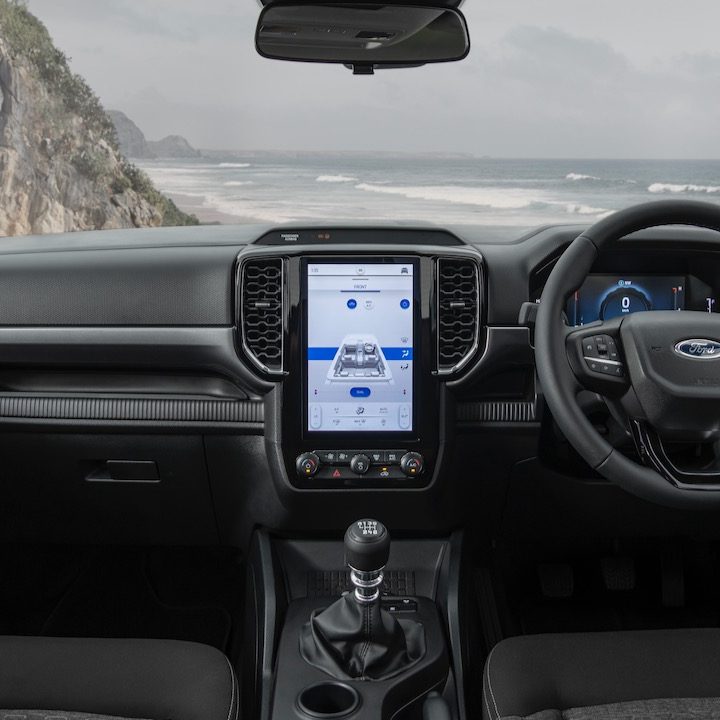 La cabina de la próxima Ford Ranger es un enorme paso hacía adelante en relación al desabrido diseño que sustituye. El nuevo modelo contará con una pantalla táctil de 10.1 pulgadas como equipo estándar y ofrecerá como opción una gigantesca pantalla de 12.0 pulgadas de orientación vertical. En ambos casos la pantalla servirá para interactuar con funciones del vehículo como la selección de los modos de manejo, monitoreo de terreno, controles de clima y naturalmente con el sistema de infoentretenimiento SYNC 4. La consola central muestra una superficie de carga inalámbrica, además de que se pueden encontrar otros puertos en las puertas y debajo de los asientos traseros.