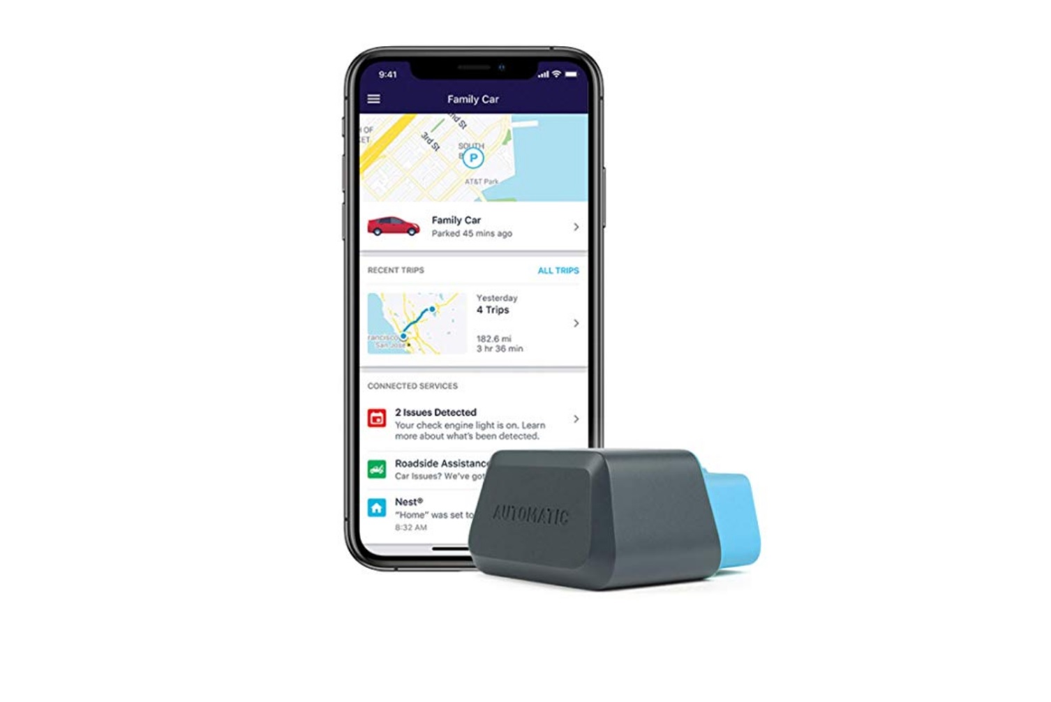 El adaptador automático para automóvil se conecta al puerto de diagnóstico estándar (OBD-II) en la mayoría de los automóviles desde 1996, y extrae datos directamente de la computadora de a bordo. La aplicación móvil emparejada también tiene muchas características convenientes, que incluyen un localizador de vehículos, un registro de kilometraje y la capacidad de notificar a los servicios de emergencia después de un accidente. El adaptador para automóvil funciona con aplicaciones de terceros, pero deberás pagar una tarifa mensual si quieres esa funcionalidad.