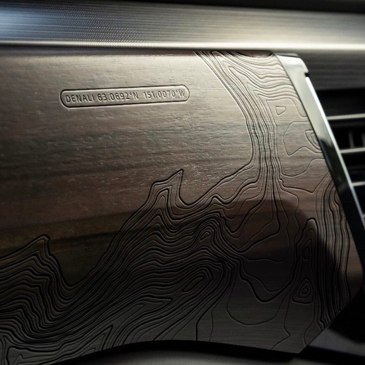 La variante Denali Ultimate viene de serie con control de marcha adaptable, techo interior de gamuza y sistema de audio Bose de 12 parlantes con rejillas de bocina de acero inoxidable grabadas, y se distingue por molduras de madera Paldao con acabado mate exclusivas combinadas con una tapicería en un hermoso color ocre al que GMC llama Alpine Umber. El panel de madera que enfrenta al pasajero delantero y los asientos están grabados con un mapa topográfico de la montaña Denali en Alaska. Además, los asientos delanteros están dotados con masajeadores con 16 movimientos.