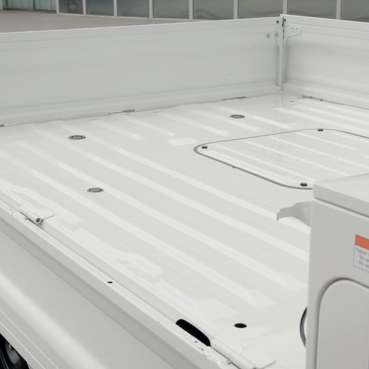 Las paredes colapsables de su caja de carga son una solución ingeniosa a las dificultades de cargar una pickup con rapidez, mientras que su versatilidad alivia el trabajo de los obreros de la construcción al transportar o remolcar desde equipos pesados hasta agua fría para aliviar las jornadas bajo el intenso sol de Nuevo México, el estado donde fue probado.