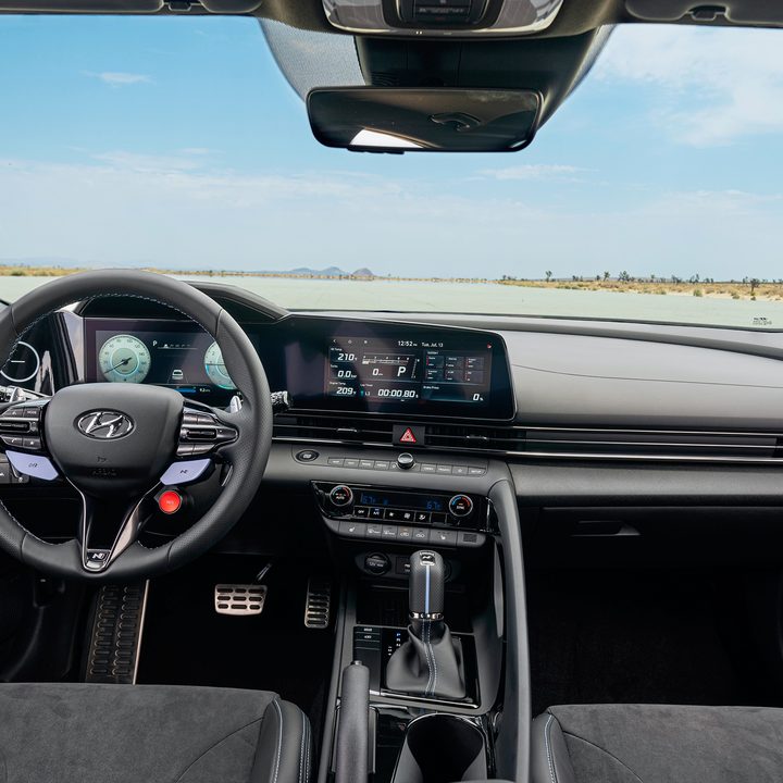 El interior del Hyundai Elantra N 2022 es mucho menos dramático que su exterior, pero tiene algunas sorpresas con las que no cuentan los modelos regulares de la línea. Entre ellos encontramos marcas específicas de N en el volante, los asientos, los pedales y la palanca de cambios, y botones en el volante para activar modos de conducción personalizados previamente por el conductor con un solo toque.
