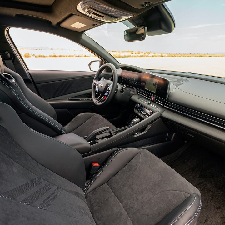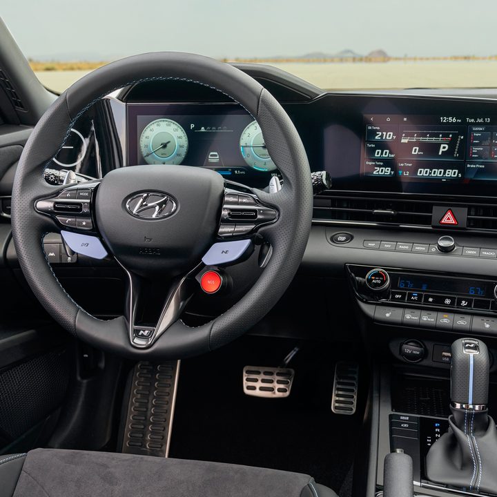 La pantalla táctil de 10.3 pulgadas del sistema de infoentretenimiento con conectividad Apple CarPlay y Android Auto, sistema de navegación y radio satelital, es equipo de norma. También lo es la pantalla de instrumentos digitales semejante a la que conseguimos en el Elantra Limited, con la diferencia de que el Elantra N cuenta con medidores presión del turboalimentador, la presión del acelerador y del freno, la temperatura del aceite y lecturas específicas para el manejo en pista.