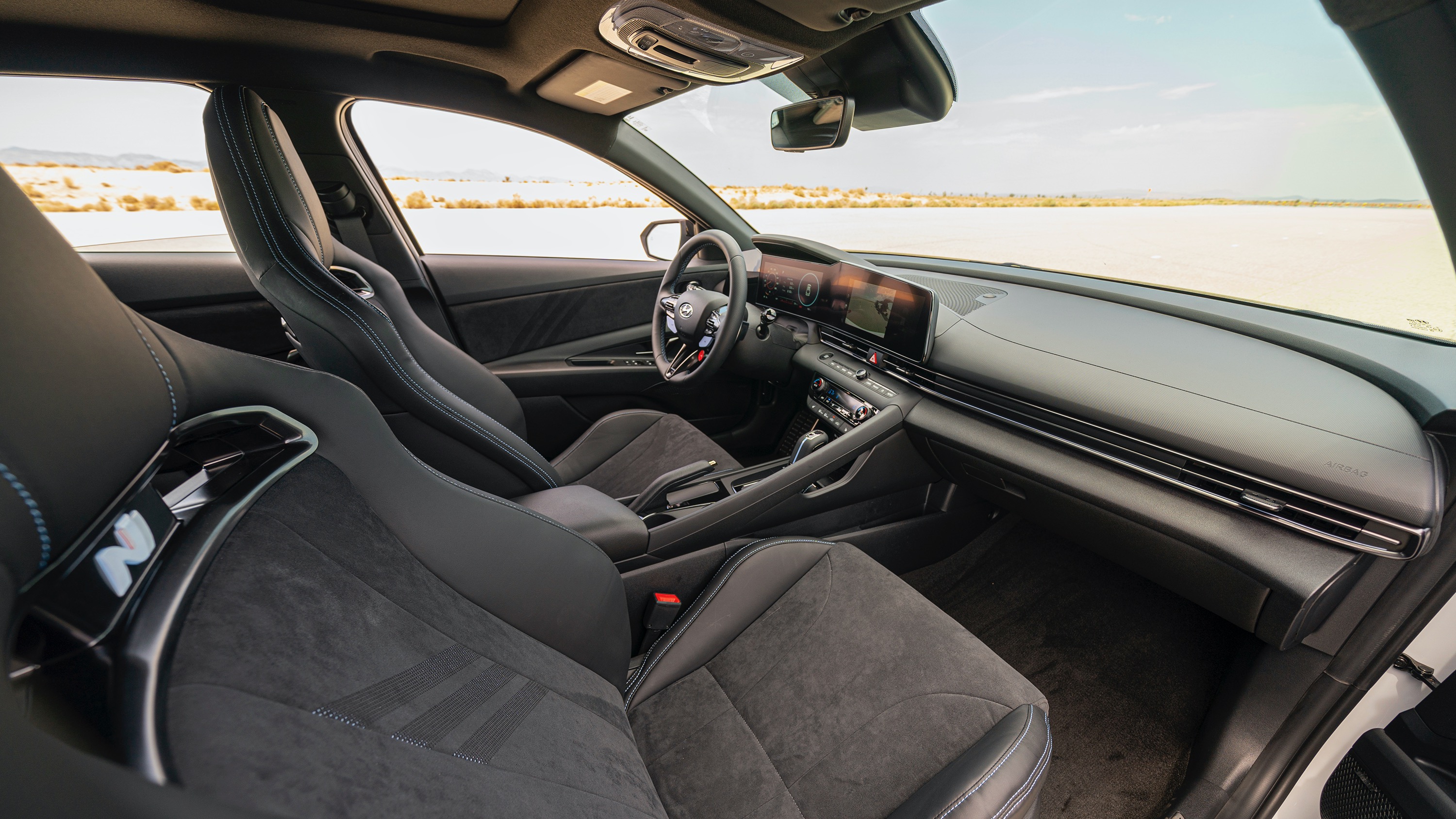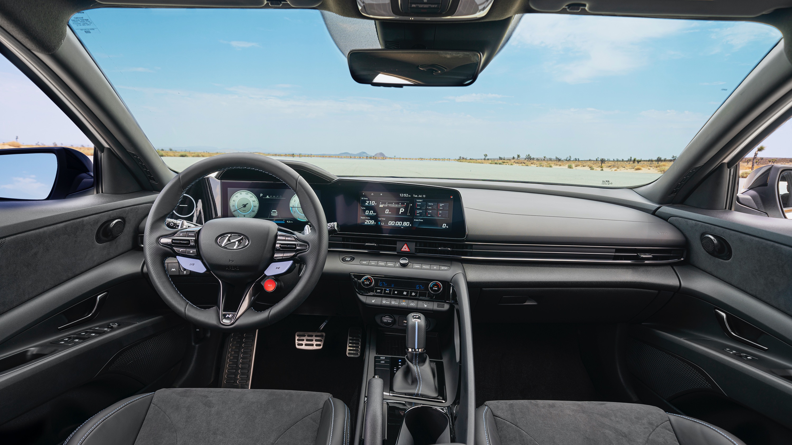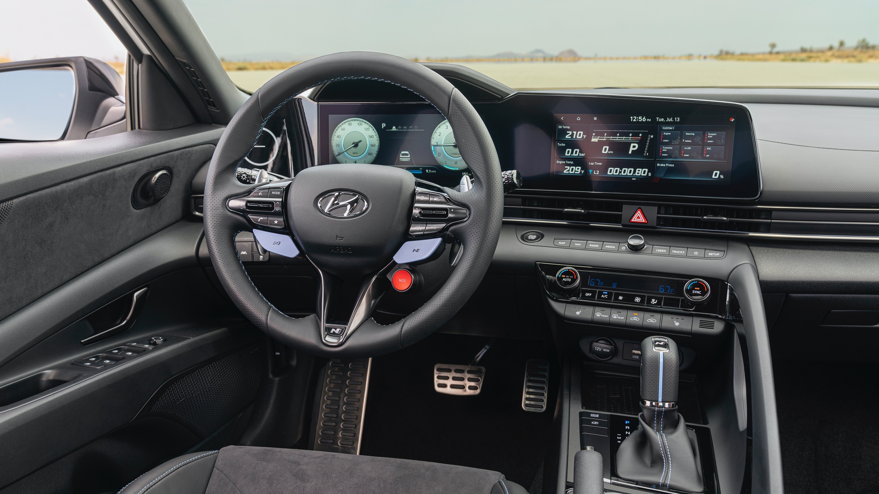 El interior del Hyundai Elantra N 2022 es mucho menos dramático que su exterior, pero tiene algunas sorpresas con las que no cuentan los modelos regulares de la línea. Entre ellos encontramos marcas específicas de N en el volante, los asientos, los pedales y la palanca de cambios, y botones en el volante para activar modos de conducción personalizados previamente por el conductor con un solo toque.