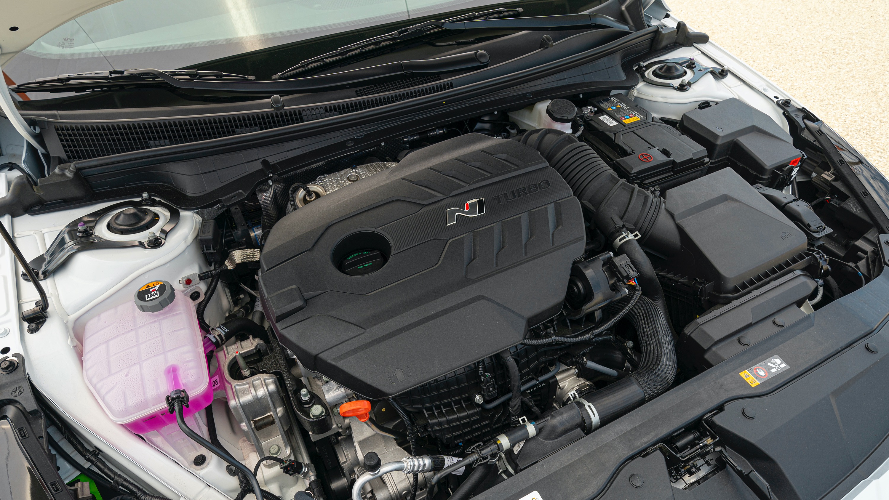 Debajo de la tapa del motor del Elantra N hay un cuatro cilindros turboalimentado de 2.0 litros de desplazamiento que produce 276 caballos de fuerza y 289 lb-pie de torque, que llegan a las ruedas delanteras a través de una transmisión manual estándar de seis velocidades con igualador de revoluciones.