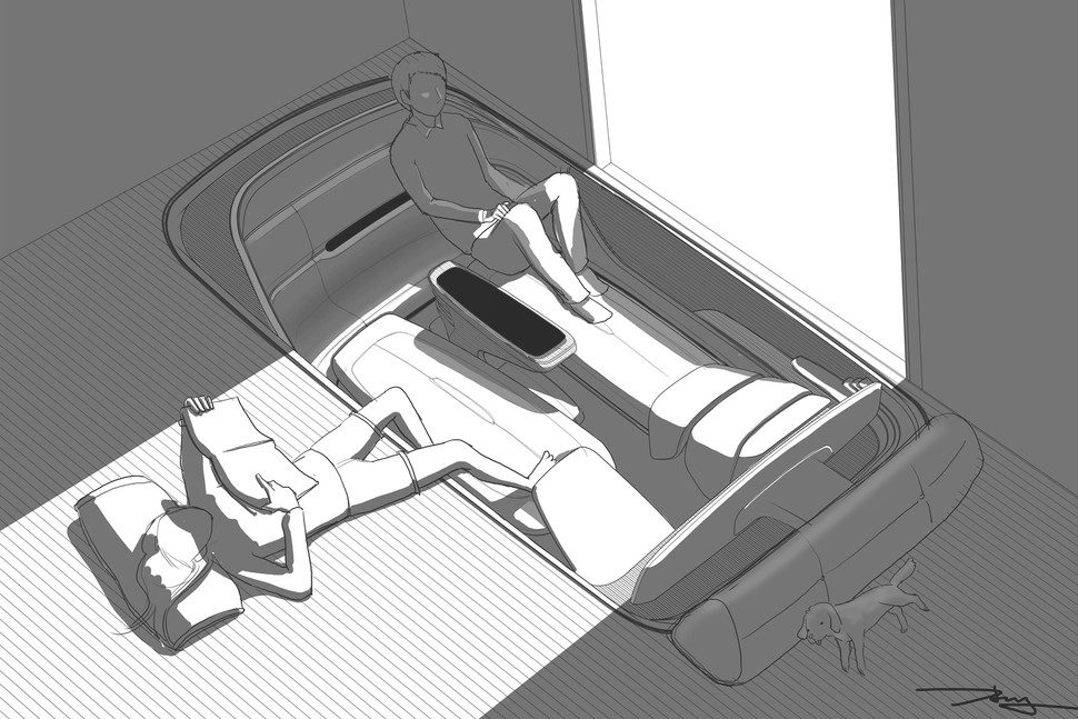 El asiento gira de nuevo al interior del coche cuando el usuario necesita salir de la casa. El vehículo es totalmente autónomo, por lo que este concepto “de un solo espacio” permite a los automovilistas continuar con lo que estaban haciendo, ya sea trabajo o relajándose, sin necesidad de empacar ni buscar las llaves. Un video de demostración revela que el concepto evita las convencionales puertas con bisagras laterales, y en su lugar adopta una puerta única, que se abre de arriba a abajo, proporcionando un acceso sin obstáculos al compartimiento de pasajeros.