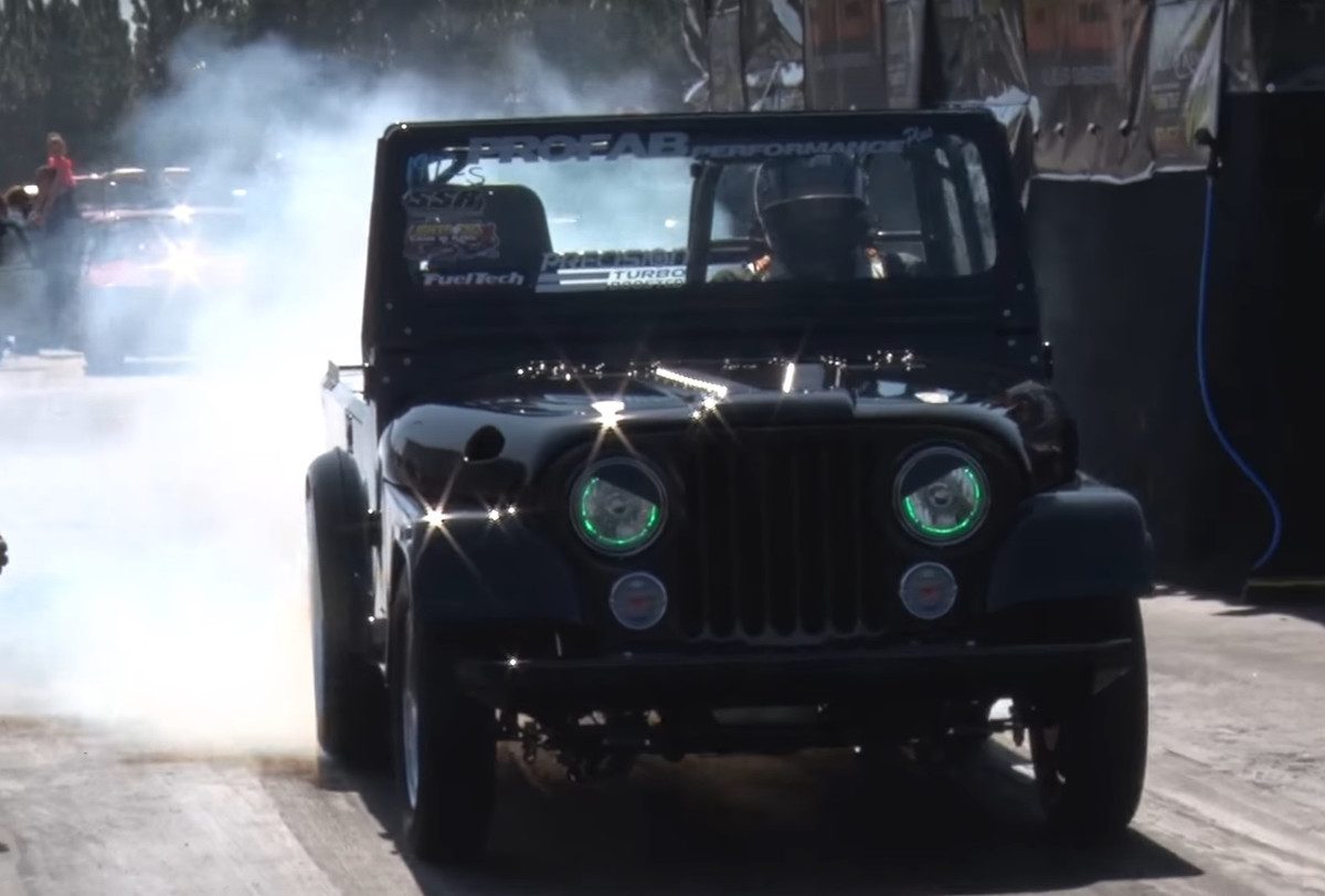 Este vehículo para “arrancones” (carreras de aceleración) que vemos en el vídeo que encabeza esta nota nació a la vida como un clásico Jeep CJ-7, aunque ya casi todos sus componentes fueron reemplazados, mejorados o eliminados. Su motor es ahora un V8 altamente modificado, sacado del compartimiento de piezas de Ford y equipado con una serie de mejoras, las cuales incluyen un inmenso turbocompresor. No sabemos a ciencia cierta cuánta potencia envía a los neumáticos traseros este ocho cilindros, pero bueno: las imágenes hablan por si mismas, así que ya puedes ir sacando tus propias cuentas.