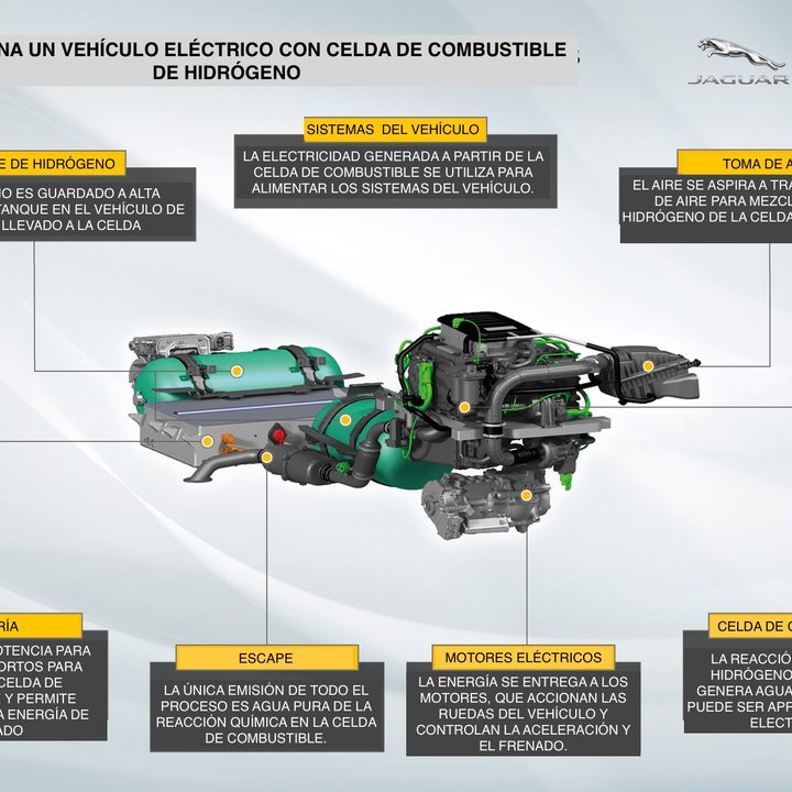 Los FCEV son vehículos eléctricos que generan su propia electricidad a partir de la separación de las moléculas de hidrógeno en combinación con el oxígeno del ambiente, así generan electricidad, calor y agua, y no gases contaminantes. Por lo tanto, en lugar de una pesada batería necesitan un tanque para almacenar el hidrógeno líquido y no necesitan conectarse a estaciones de carga por largas horas. Jaguar ve a los FCEV como un complemento a los vehículos eléctricos de batería en el camino hacia un futuro sin emisiones.