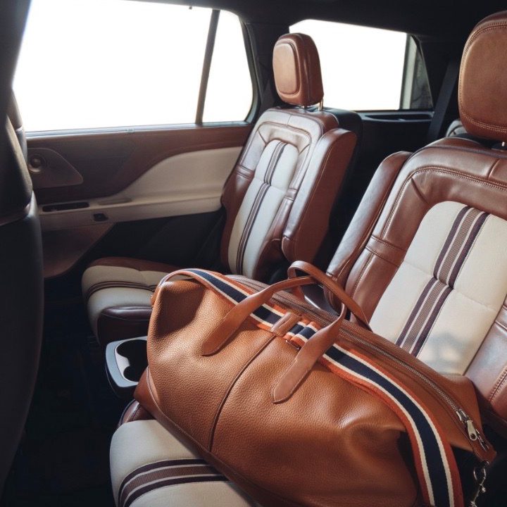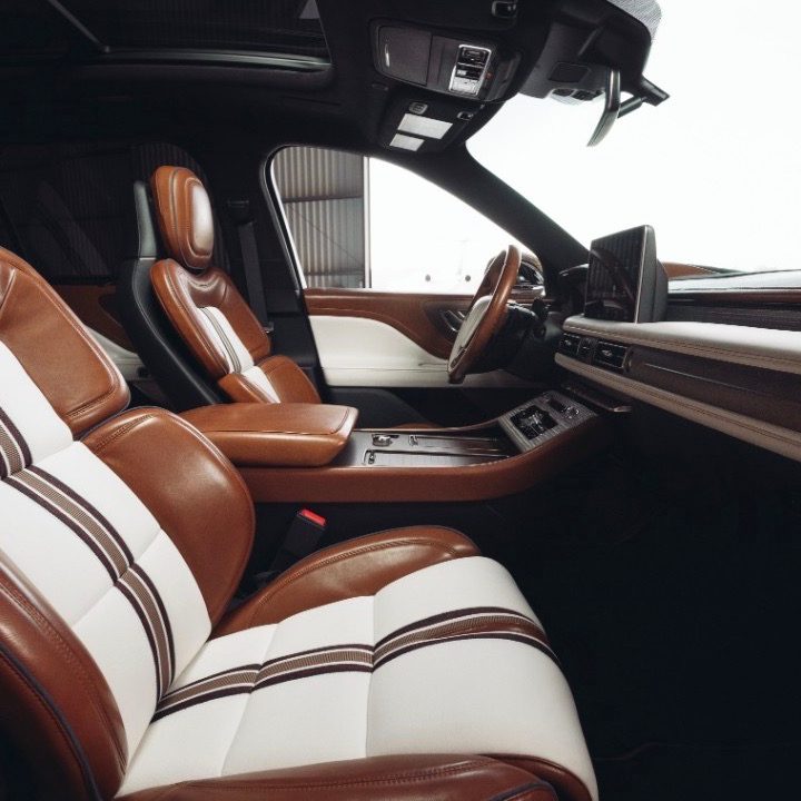 La cabina de la Aviator, que ya era por sí misma una de las más lujosas y hermosas de la industria, se ve mejorada con insertos de gamuza color crema combinados con cuero color whisky de Shinola. Las costuras de los asientos están inspiradas en la franja característica de los productos de Shinola y se ajustan a la proporción para adaptarse al tamaño y la forma de los siete asientos, mientras que la consola central cuenta con un acabado de malla metálica tejida que también se puede ver en la consola de la segunda fila.