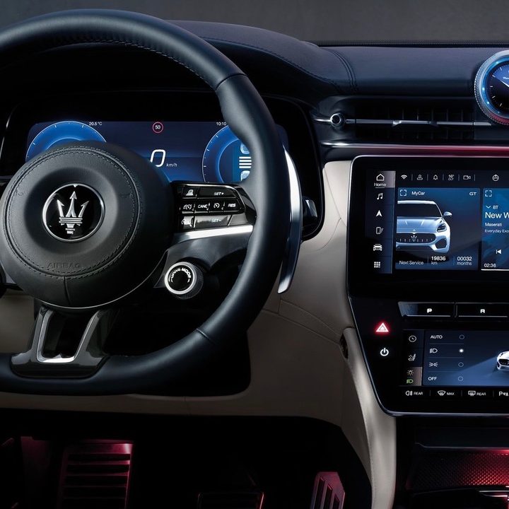 La lujosa cabina de la Grecale está dotada de cuatro pantallas digitales. Una de ellas, frente al conductor, contiene el cuadro de instrumentos, mientras que las otras tres se encuentran en el centro del tablero: una superior de 12.3 pulgadas para los sistema de navegación y audio, entre otros configurables, y una inferior de 8.8 pulgadas usada para los controles del sistema climático. ¿Cuál es la cuarta pantalla? El reloj. Maserati también ofrecerá un cuadro de instrumentos proyectados en el parabrisas (HUD) opcional, así como un sistema de sonido Sonus faber con 21 bocinas y 1,000 vatios de potencia.