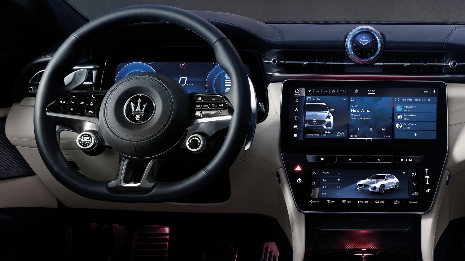 La lujosa cabina de la Grecale está dotada de cuatro pantallas digitales. Una de ellas, frente al conductor, contiene el cuadro de instrumentos, mientras que las otras tres se encuentran en el centro del tablero: una superior de 12.3 pulgadas para los sistema de navegación y audio, entre otros configurables, y una inferior de 8.8 pulgadas usada para los controles del sistema climático. ¿Cuál es la cuarta pantalla? El reloj. Maserati también ofrecerá un cuadro de instrumentos proyectados en el parabrisas (HUD) opcional, así como un sistema de sonido Sonus faber con 21 bocinas y 1,000 vatios de potencia.