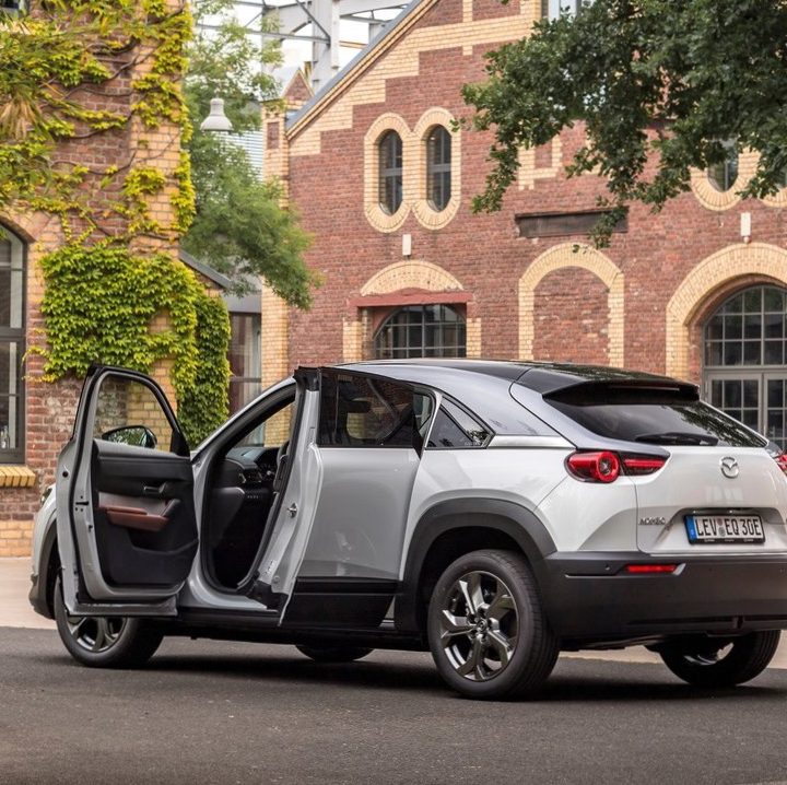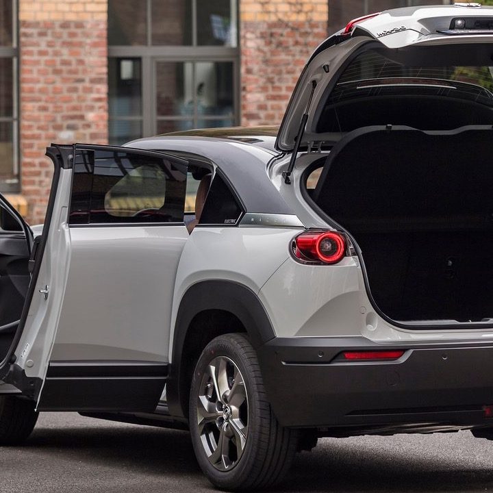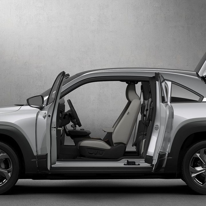 A pesar de su identidad visual, la Mazda MX-30 es fácil de distinguir de la CX-30 gracias a un par de puertas traseras con bisagras posteriores a las que el fabricante nipón se refiere como freestyle doors, que ya había usado en el lado del conductor del RX-8 y que se mantienen el Hyundai Veloster y en el antiguo BMW i3, entre otros vehículos.