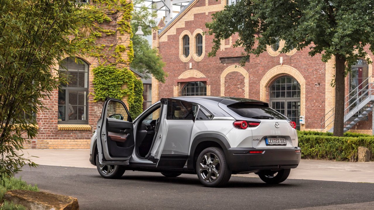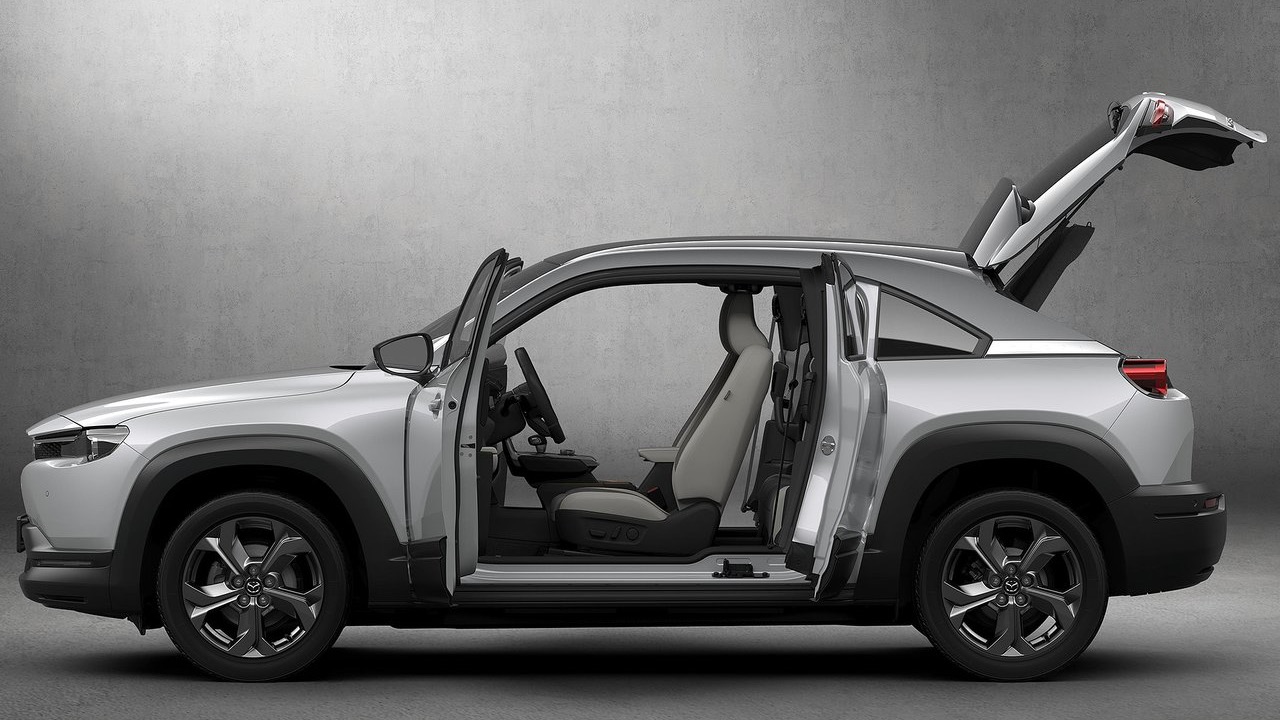 A pesar de su identidad visual, la Mazda MX-30 es fácil de distinguir de la CX-30 gracias a un par de puertas traseras con bisagras posteriores a las que el fabricante nipón se refiere como freestyle doors, que ya había usado en el lado del conductor del RX-8 y que se mantienen el Hyundai Veloster y en el antiguo BMW i3, entre otros vehículos.