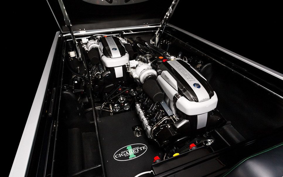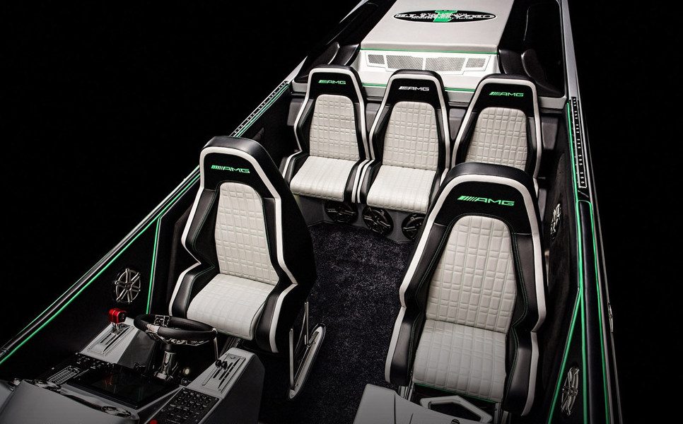 Mientras que bajo el capó del AMG GT R nos encontramos un V8 de 4.0 litros doble turbo que produce 577 caballos de fuerza, el motor del Marauder AMG viene con “un poco más” de músculo. En concreto, hablamos de dos motores Mercury Racing, los cuales generan hasta 3,100 caballos de potencia. Los motores tienen dos ajustes de rendimiento diferentes, que el operador puede seleccionar con sólo pulsar una tecla. En modo Carrera, los motores producen 1,550 caballos cada uno, aunque requieren de un combustible. En modo Pleasure, cada uno genera 1,350 hp, pudiendo funcionar con combustible de 91 octanos.