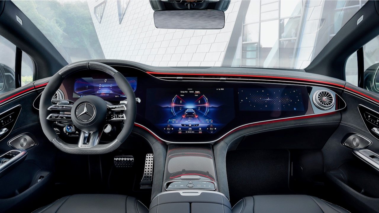 El interior del Mercedes-AMG se distingue por sus butacas deportivas de respaldo alto, un nuevo volante con un fondo plano y superficies oscuras con detalles en rojo contrastante. La pantalla gigante Hyperscreen que cubre la totalidad del tablero es ofrecida como opción, y hay sonidos específicos de AMG dentro de la cabina diseñados para evocar una respuesta emocional en el conductor, como aquellos específicos para cada modo de conducción, así como para el modo Race Start.