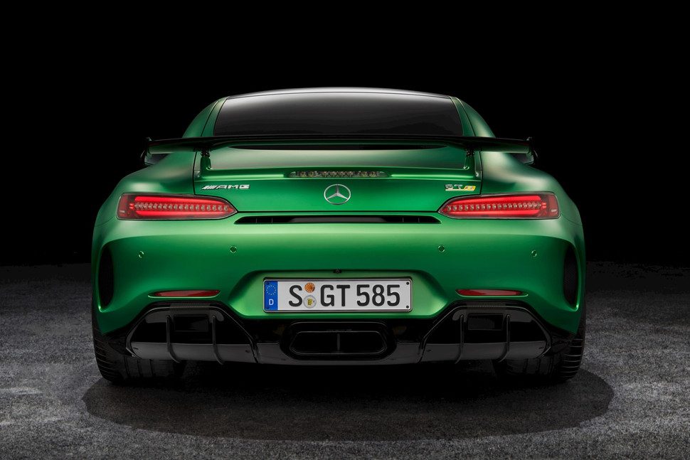 Aunque por el nombre podría uno llegar a confundirlo con cierto Nissan, el AMG GT R es un Mercedes de tomo y lomo. La parrilla «Panamericana» que por primera vez luce (como la del AMG GT3 de carreras) le otorga un aspecto único y agresivo. Los guardabarros delanteros están hechos de fibra de carbono, y son 1.8 pulgadas más anchos que en el AMG GT S. Mientras, los guardabarros traseros tienen extensiones de aluminio que los ensanchan 2.2 pulgadas. Eso le permitió a AMG poder ensanchar sus ruedas y usar unas llantas de 20 pulgadas. La parte trasera está decorada por un gran alerón, así también como una salida de escape central.