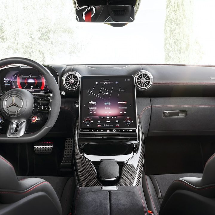 El interior muestra actualizaciones tecnológicas significativas y una limpieza de diseño de la que tanto el SL anterior como el GT carecían, la cual fue posible gracias a la enorme pantalla táctil posicionada de manera vertical para interactuar con el sistema de información y entretenimiento MBUX, cuya inclinación puede ser ajustada electrónicamente entre 12 a 32 grados a fin de facilitar su uso y evitar el reflejo del sol.