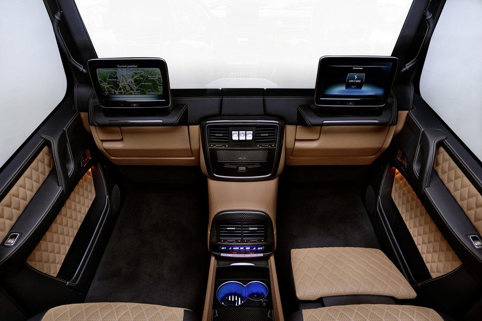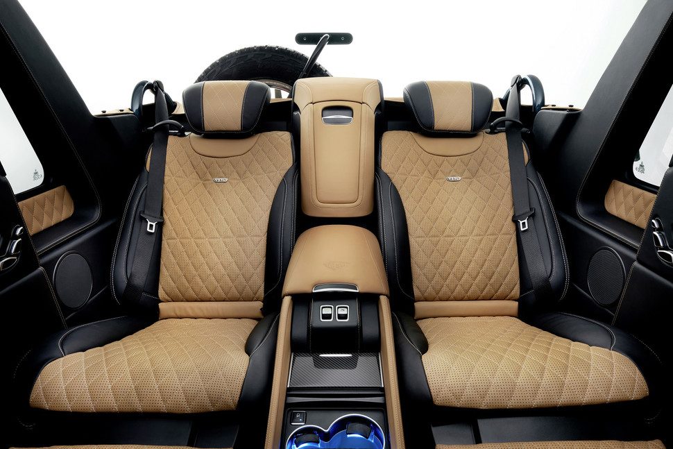 Con 210 pulgadas de largo y 87 pulgadas de alto, lo cierto es que el SUV de Maybach deja “enano” al Mercedes Clase G estándar. La chapa adicional entre los ejes beneficia a los pasajeros que van en la parte trasera. El tradicional banco trasero ha sido sustituido por un par de asientos individuales de cuero tapizados, tomados del Clase S. Pueden reclinarse completamente y proporcionar un masaje. No hace falta decir que tienen calefacción y aire acondicionado, también.
