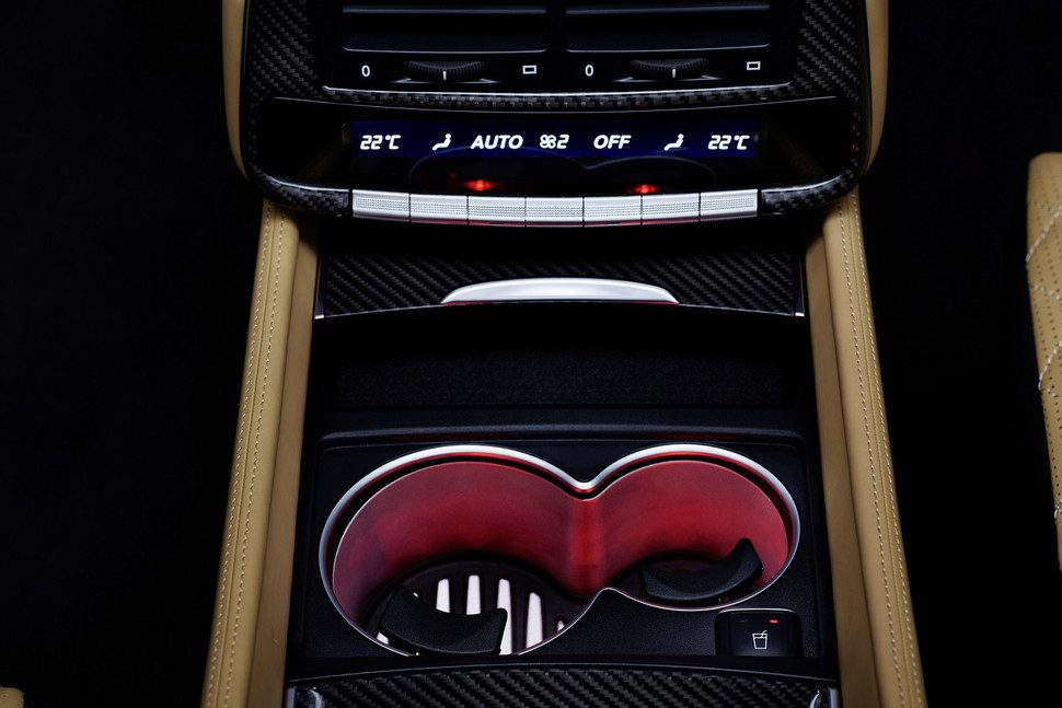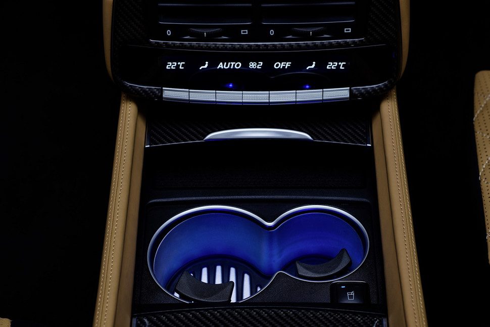 Un interruptor en la consola central abre y cierra una división de vidrio que separa el compartimiento delantero del trasero. Con la partición cerrada, los ocupantes de la parte trasera viajan en un espacio privado y relajado, adornado con su propio sistema de control climático, tabletas de estilo avión y pantallas de alta resolución. La capota del techo se acciona electrónicamente con sólo pulsar un botón.
