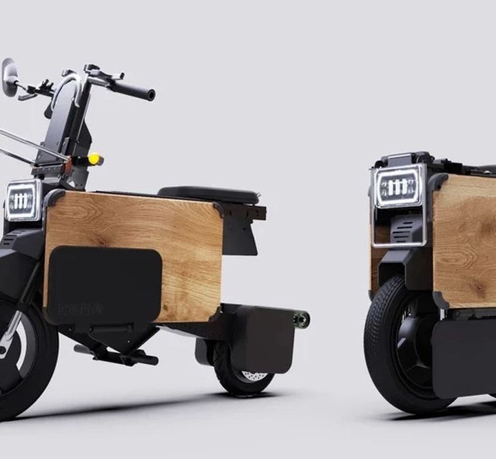 La empresa japonesa Icoma presenta una motocicleta que no necesita estacionarse cuando se deja de usar, ya que simplemente basta con doblarla y guardarla debajo de la mesa.
