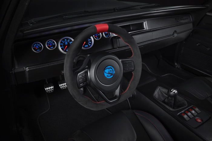 Bajo sus voluminosos guardafangos de fibra de vidrio, encontraremos rines Devil’s delanteros de 20 pulgadas –ya vistos en el Challenger SRT Hellcat- y los traseros de 21 pulgadas hechos a medida. Sus frenos de disco Brembo con pinzas de seis pistones proporcionan una notable ventaja en términos de distancia de detención en caomparación al Charger de 1968, agregó la compañía.