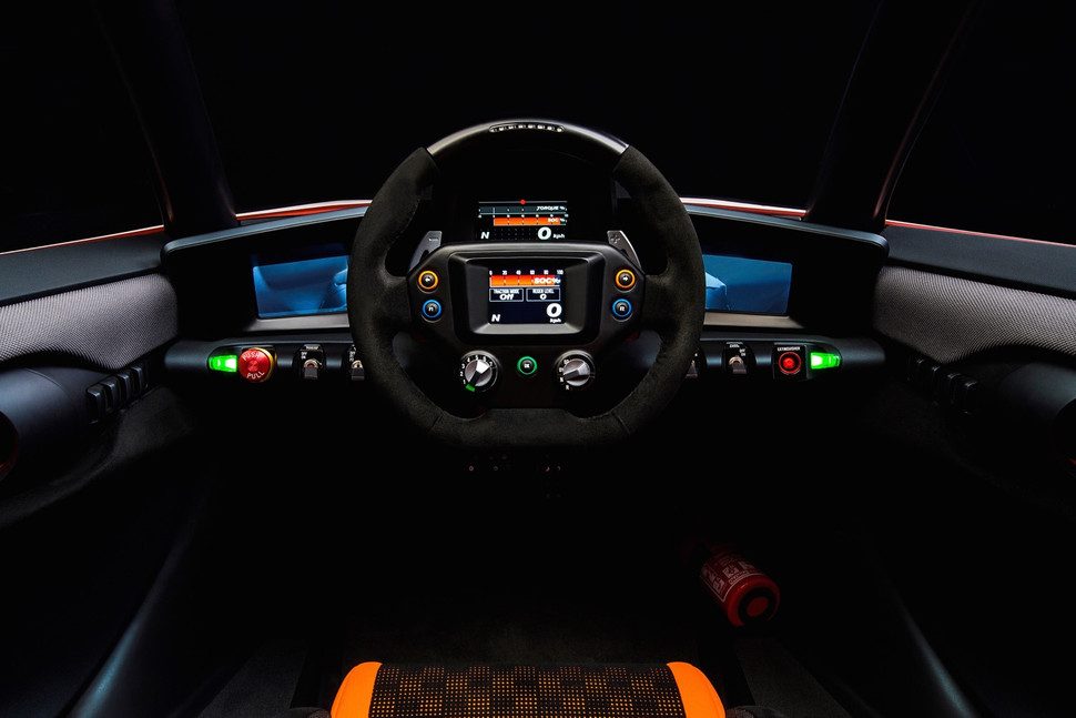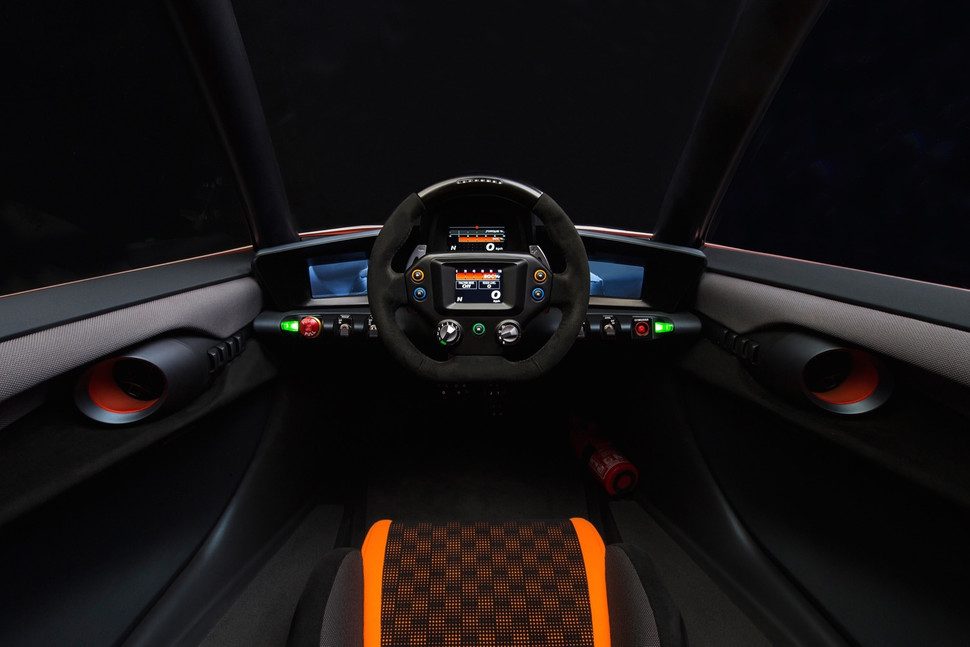 Sus puertas se abren hacia atrás en bisagra, y su cabina es tan radical como el exterior. El BladeGlider es de tres plazas, con un asiento para el conductor en el frente y dos asientos para pasajeros en la parte trasera. La mayoría de los controles están montados en el volante, y tres pantallas digitales constituyen prácticamente toda la instrumentación. El BladeGlider también tiene cámaras en lugar de espejos laterales, algo que muchos fabricantes de automóviles están tratando de poner en práctica en sus respectivos modelos de producción.