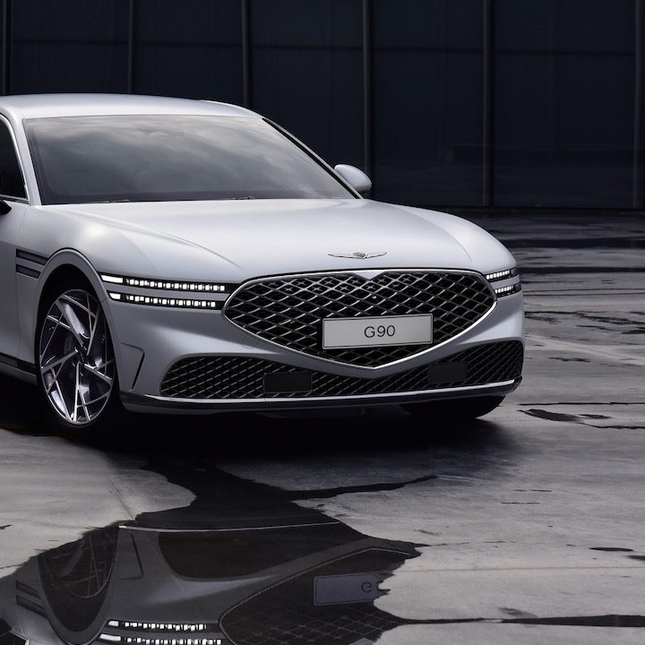 Aparte de las claves de diseño mencionadas, el G90 se distingue por una tapa de motor estilo “concha de almeja” a fin de lograr un aspecto más limpio y libre de separaciones, las cuales son disimuladas en las líneas de los nichos de las ruedas y de las luces laterales, que por cierto son unas de las más grandes y vistosas que hemos visto en un auto de lujo. Estas luces sirven como continuación de los faros frontales hasta morir en el borde frontal de la puerta delantera.