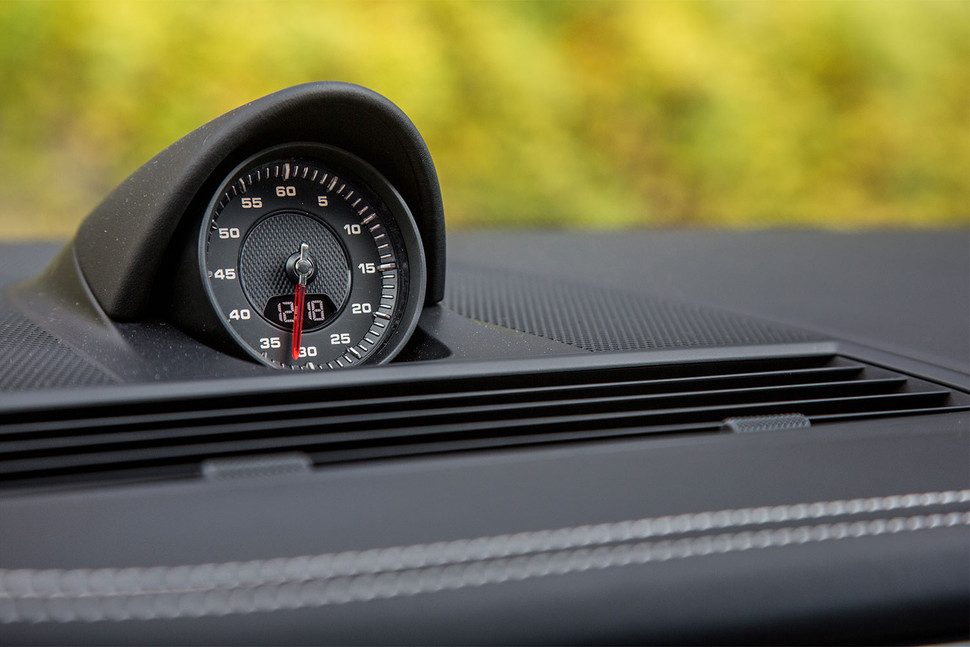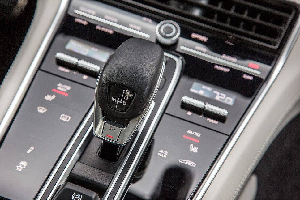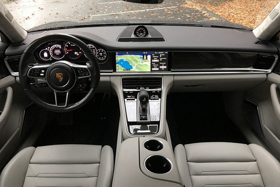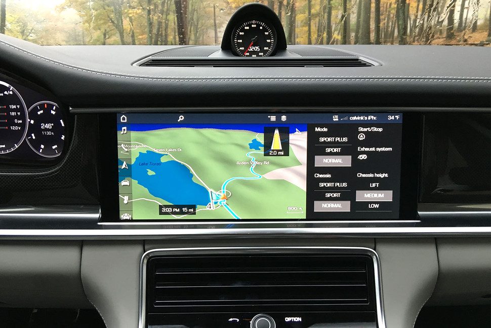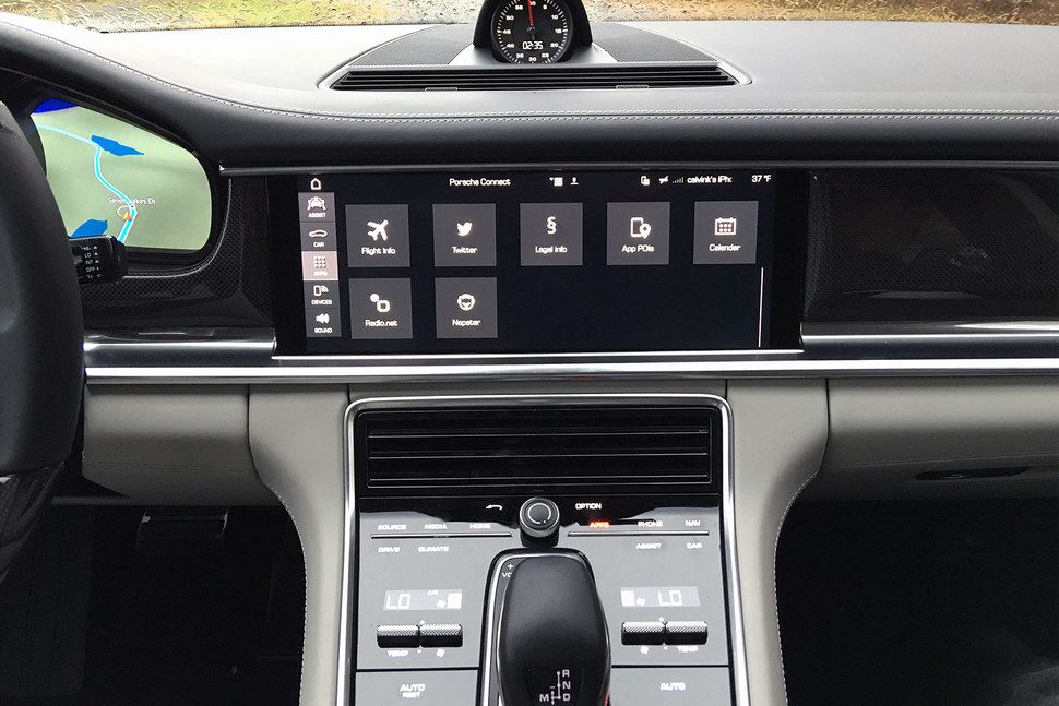La consola central, ahora más elegante y más limpia gracias a un nuevo diseño, está dominada por una nueva pantalla táctil de alta resolución de 12,3 pulgadas. Adaptable, este sistema de entretenimiento y conectividad de próxima generación, conocido como Porsche Communication Management (PCM), es el sitio en donde varios millones de líneas de código entran en juego. Esencialmente, son tres pantallas en una, con un menú de inicio siempre activo, comandos y sub-pantallas que pueden emerger u ocultarse al tacto. Las características estándar integradas con las aplicaciones disponibles proporcionan a los ocupantes una gran cantidad de información en forma de navegación, tráfico en tiempo real, Google Earth, Apple CarPlay, búsqueda de estacionamiento, precios de combustible, información de vuelos, notificaciones de calendario, noticias, etc.