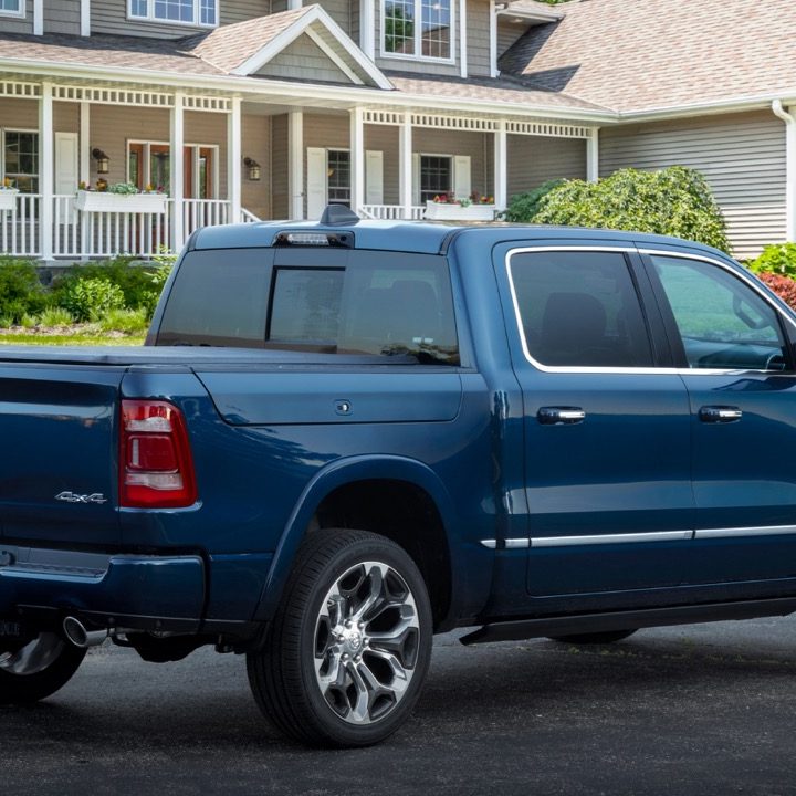 El exterior de la nueva Ram 1500 Limited 10th Anniversary Edition 2022 es de un hermoso color azul oscuro metalizado al que su fabricante se refiere como Blue Shade, además de tener un práctico portón trasero multifunción seccionado en dos partes, un escalón de acceso a la caja de carga y ganchos de amarre ajustables.