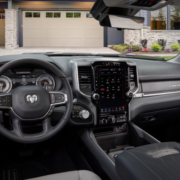 El interior de la Ram 1500 Limited 10th Anniversary Edition, con sus dos colores interiores nuevos (azul índigo y gris Sea Salt), muestra un nivel de lujo bastante convincente. Su tapicería y los detalles en cuero de sus puertas, el techo de gamuza, las aplicaciones metálicas y de madera, y la placa conmemorativa del modelo especial son genuinos. La sección digital del cuadro de instrumentos cuenta con un gráfico único que indica el modelo especial que aparece al momento de encender el motor.