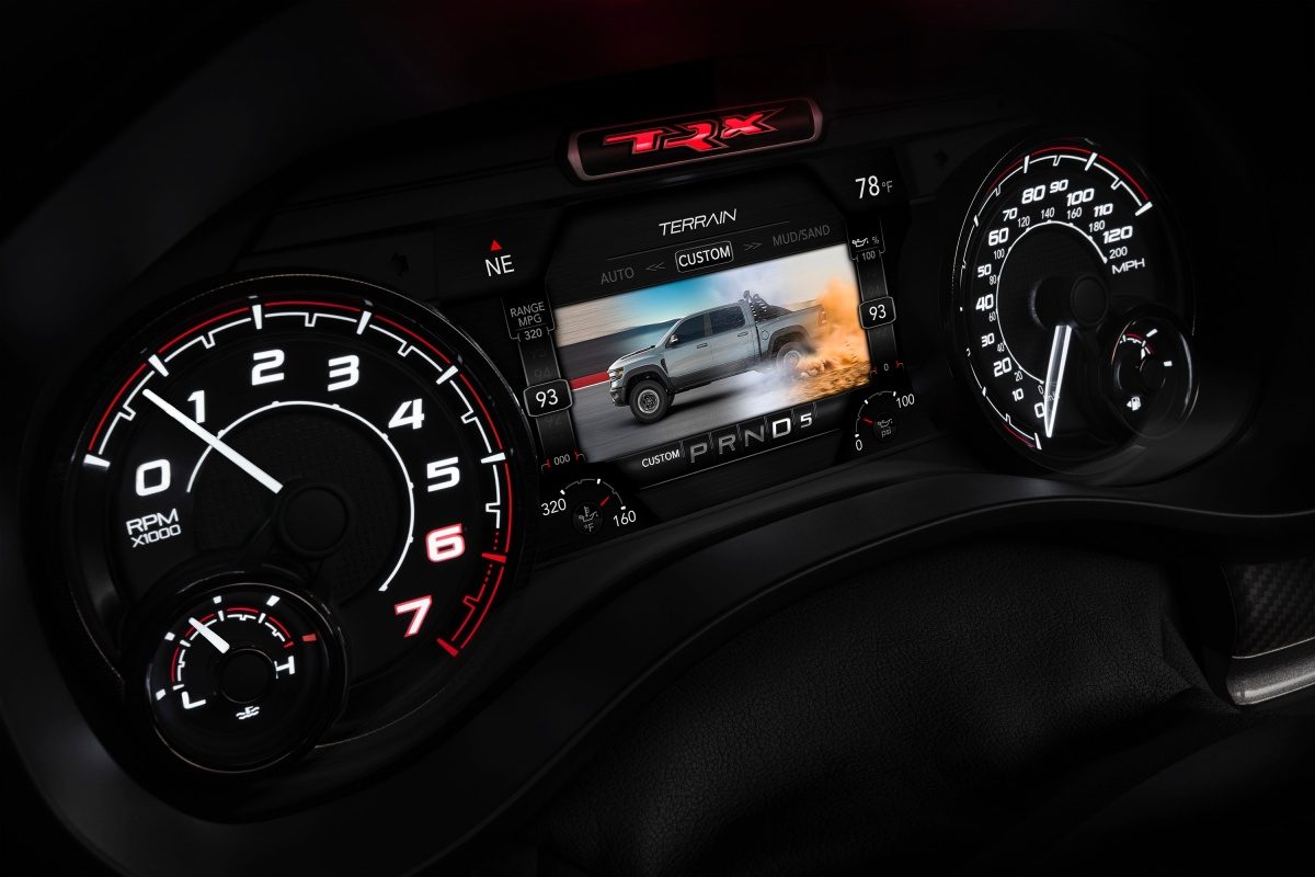 Tal como lo adelantamos, la Ram TRX empleará el motor V8 Hemi de 6.2 litros, 702 caballos y 650 lb-pie de torque —el mismo con el que cuenta el Jeep Grand Cherokee Trackhawk—, tracción 4×4 y una transmisión automática de ocho velocidades. Con esta mecánica va de 0 a 100 mph en 10.5 segundos y alcanza una velocidad máxima de 118 mph (aprox. 190 km/h).