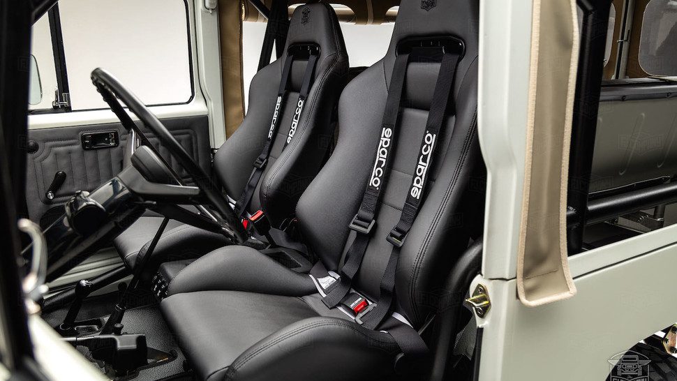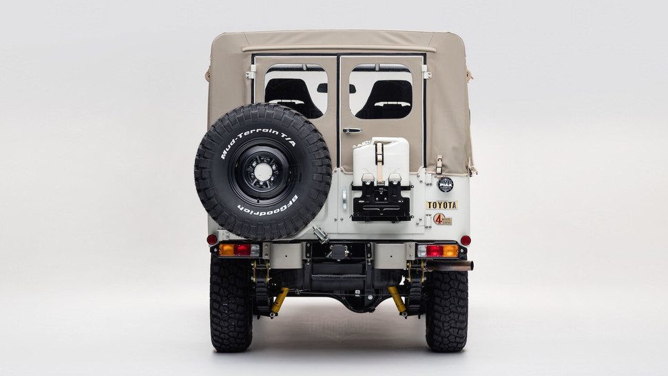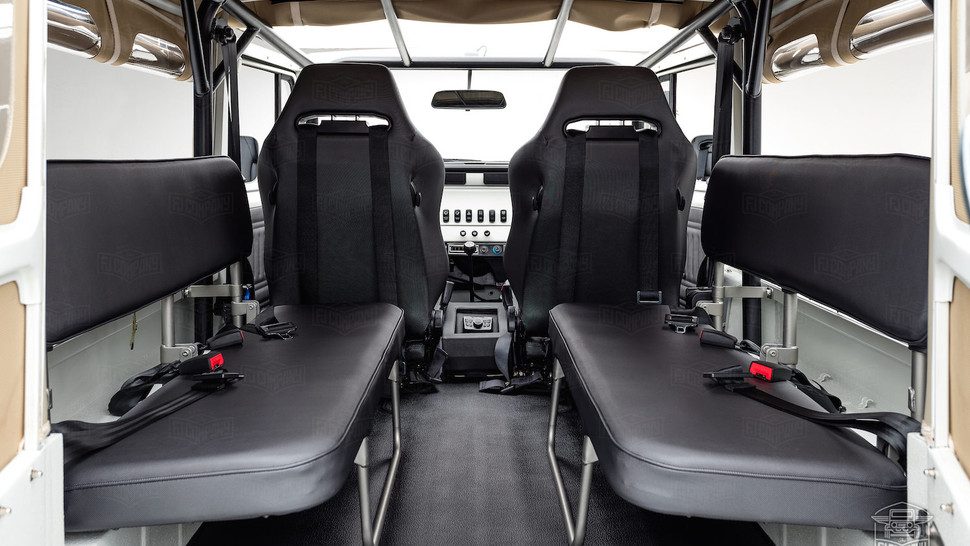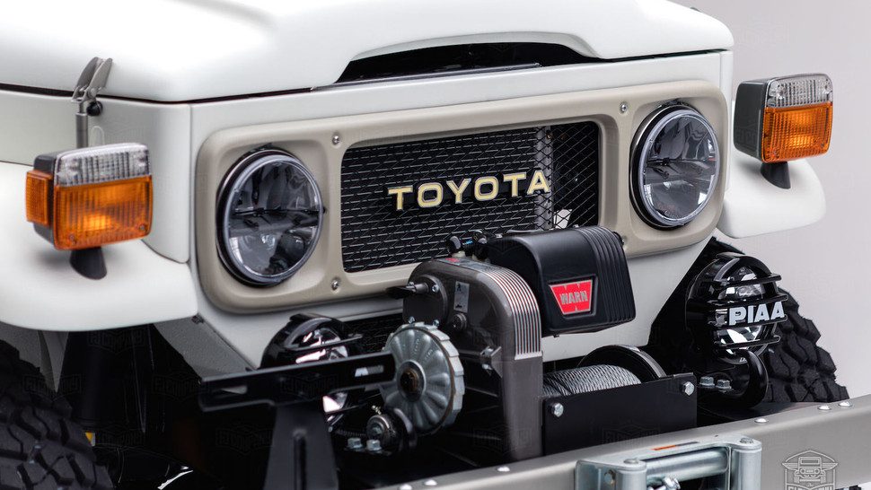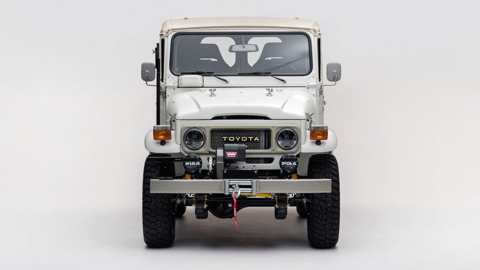 Una mirada descuidada pasaría por alto todo este trabajo interno, ya que el original Land Cruiser exterior permanece en su mayoría sin cambios. Además de una capa de pintura blanca mate, FJ Company añadió un winche Warn 8274 en el parachoques delantero original, flanqueado por un par de luces antiniebla LED de siete pulgadas. Y algo muy importante: una jaula de protección personalizada fue diseñada para mantener a todos los ocupantes a salvo, fundamental si consideramos que el techo buena parte de la carrocería trasera están cubiertos sólo con lona.