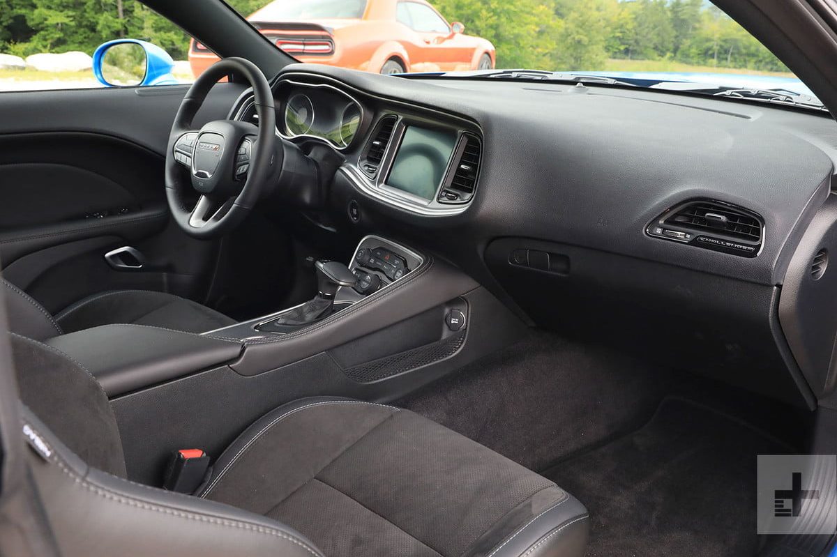Aunque el interior es en gran medida el mismo del año pasado, resaltan algunos nuevos toques, como el acabado oscuro en el panel de instrumentos y la consola, así como detalles de titanio líquido en la palanca de cambios y el volante. Como en años anteriores, el logotipo de Scat Pack Bee está bordado en los asientos delanteros, un toque exclusivo que diferencia la cabina del resto de la línea Challenger.