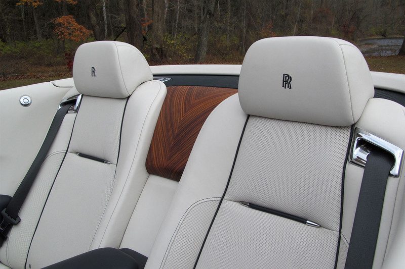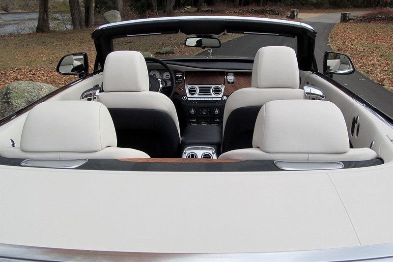 El Dawn tiene un interior bastante espacioso y muy bien equipado. Rolls siempre se ha enorgullecido de la artesanía de sus interiores, y el Dawn no decepciona. Cada superficie está cubierta de cuero y madera. El resto del interior es tan agradable como sus materiales. Los asientos son tan cómodos que te sientes más como en una sala de estar que en un auto, pero además ofrecen un montón de apoyo en las curvas. Impresionante para un convertible de dos puertas, aunque también hay suficiente espacio en los asientos traseros para un par de adultos.