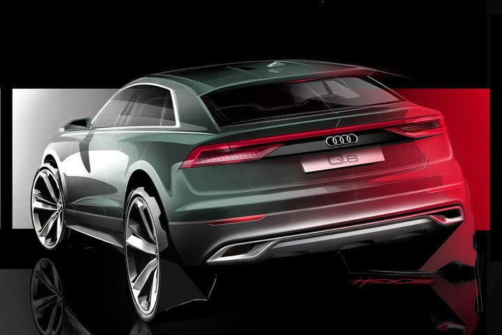 La firma alemana publicó un boceto artístico a modo de adelanto en su página de Facebook, todo para darnos una idea de cómo se verá. Podemos decir que tomará prestado una multitud de señales de estilo del concepto Q8 presentado el año pasado en el Salón del Automóvil de Detroit. Grande y cargo de tecnología, se montará en la misma plataforma básica que el Q7, el Lamborghini Urus y el Bentley Bentayga, entre otros modelos, aunque sus estilistas enfocaron el diseño en una dirección más deportiva, con una parrilla ancha y vertical y una línea de techo más agresiva. El boceto muestra una parte trasera inspirada en el último A7, con LEDs delgadas conectadas por una barra de luces.