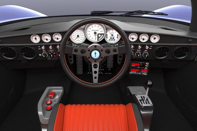 El interior es aún más llamativo que el exterior. El conductor se sienta al frente y al centro, mientras que los pasajeros están posicionados a ambos lados, una configuración iniciada por el McLaren F1 en la década de 1990. Debido a que no es un automóvil producido en serie, el 004S no necesita cumplir con las normas de seguridad que exige el uso de airbags, entre otras cosas. El resultado es una cabina muy básica, con nueve diales analógicos claramente distribuidos en el salpicadero, un volante de tres radios, un puñado de interruptores y una maravillosa palanca de cambios.