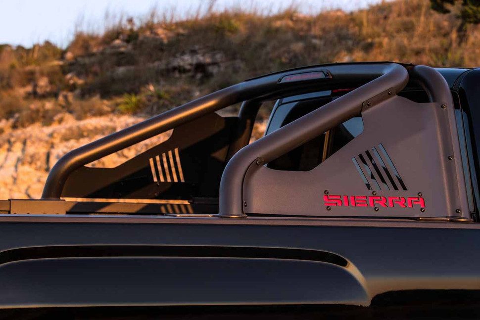 Visualmente, la camioneta Sierra equipada con el paquete All Terrrain X se destaca a la vista gracias a un puñado de piezas específicas. El paquete incluye llantas de aluminio negras de 18 pulgadas y envueltas en neumáticos Goodyear; una rejilla del color de la carrocería; espejos negros; estribos laterales, y una barra deportiva de color negro montada en la cama. La camioneta está disponible en negro ónix (como en las fotos), aunque a los compradores que lo prefieran la podrán encargar también en color blanco.