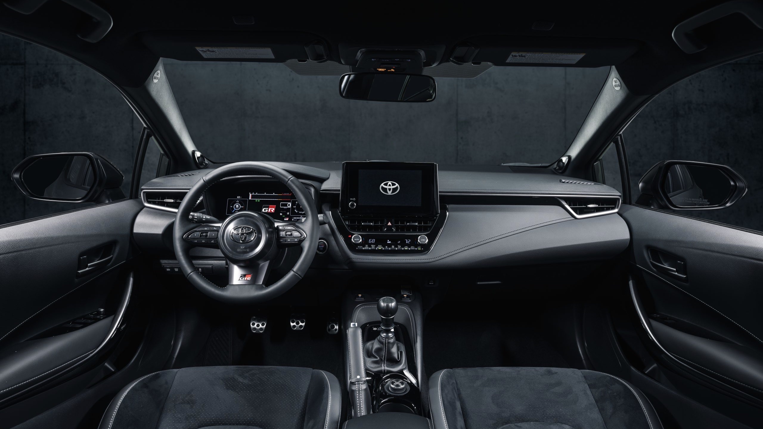 El interior del GR Corolla tiene una pantalla de instrumentos e información para el conductor de 12.3 pulgadas, que incluye vistas del modo de tracción total seleccionado, la presión del turbo, el indicador de posición de marcha, velocímetro y tacómetro. Asimismo, hay una pantalla de información y entretenimiento de 8.0 pulgadas en el centro del tablero.