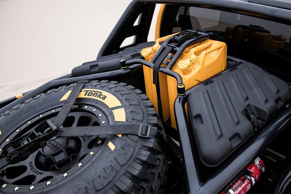 Notablemente, el parachoques delantero tiene ahora un aspecto robusto, mientras que un cabrestante y un protector de cárter de aleación le dan al conductor toda la tranquilidad necesaria, incluso cuando las cosas se ponen algo complicadas. “Calza” unos neumáticos de marca de Tonka de 35 pulgadas, colocados debajo de unos enormes guardabarros, y con las modificaciones de suspensión gana seis pulgadas adicionales de distancia desde el suelo. El esnórquel adjunto a la columna A no está allí de adorno, por si acaso.