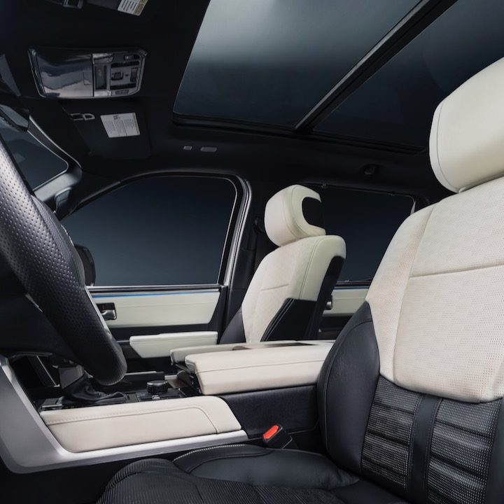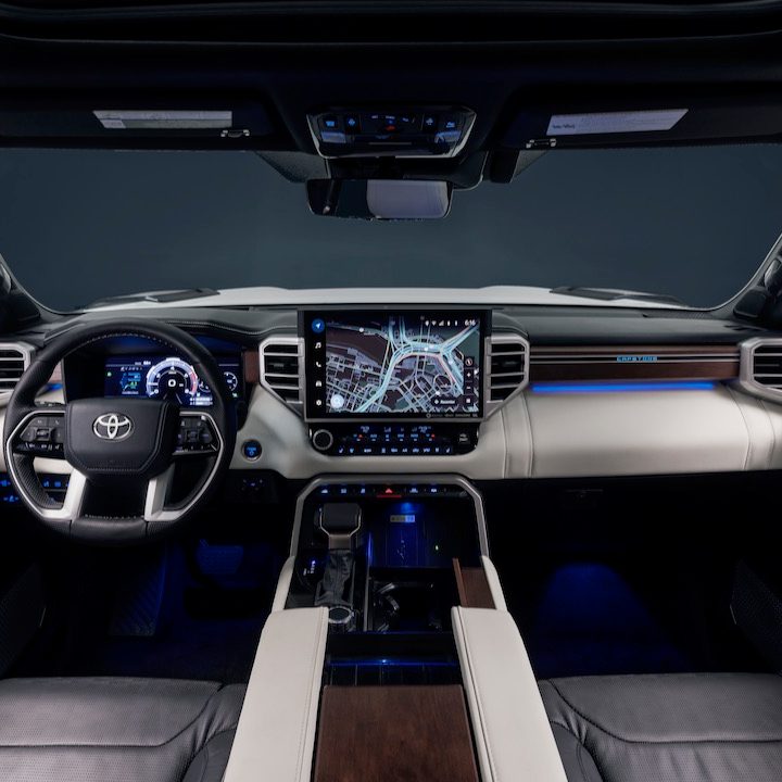 La cabina de esta versión abanderada de la línea Tundra se distingue por su tapicería de cuero perforado semianilina en blanco y negro, inserciones de madera real en el tablero, un techo corredizo automático, ventanas delanteras —exclusivas de la versión— con vidrio acústico para filtrar mejor el ruido exterior, pantalla táctil de 14.0 pulgadas con Apple CarPlay inalámbrico y Android Auto, y un cuadro de instrumentos digital de 12.3 pulgadas.