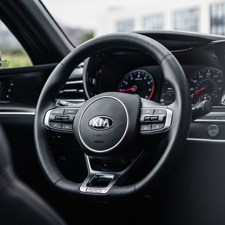 Hermosos asientos deportivos tapizados en cuero ofrecen el soporte y la firmeza necesarios para un manejo emocionante sin romperte la espalda en viajes largos. El volante de fondo plano es un recuerdo permanente de que el K5 GT es un auto que respalda sus pretensiones deportivas.