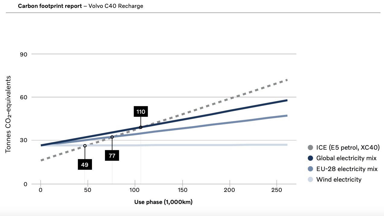 En el escenario del uso de electricidad de origen 100 por ciento renovable, la C40 Recharge compensa las emisiones creadas en su fabricación después de recorrer 49,000 km (30,625 millas), ese umbral aumenta a 77,000 km (48,125 mi) con la mezcla europea y a 110,000 km (68,750 mi) con la mezcla mundial. El estudio nunca menciona el umbral de los 200,000 km (125,000 mi), excepto como el estimado de vida útil del vehículo, el que hay que decir que en ese momento tendrá una huella de carbono negativa, ya que habrá compensado más CO2 del que contribuyó durante su uso y operación.