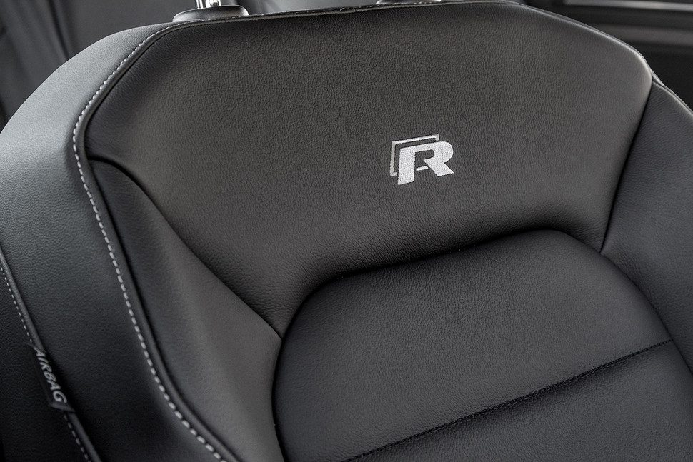 El interior ofrece asientos deportivos tapizados con una mezcla de tela y Alcántara, además de un volante deportivo de cuero de tres radios, iluminación ambiente, climatizador y un sistema de Radio-CD con pantalla táctil. El Volkswagen Golf R más potente y ahorrador de todos los tiempos llega al mercado como modelo de tres y cinco puertas, aunque en EE.UU. no podremos ver el modelo de 5.