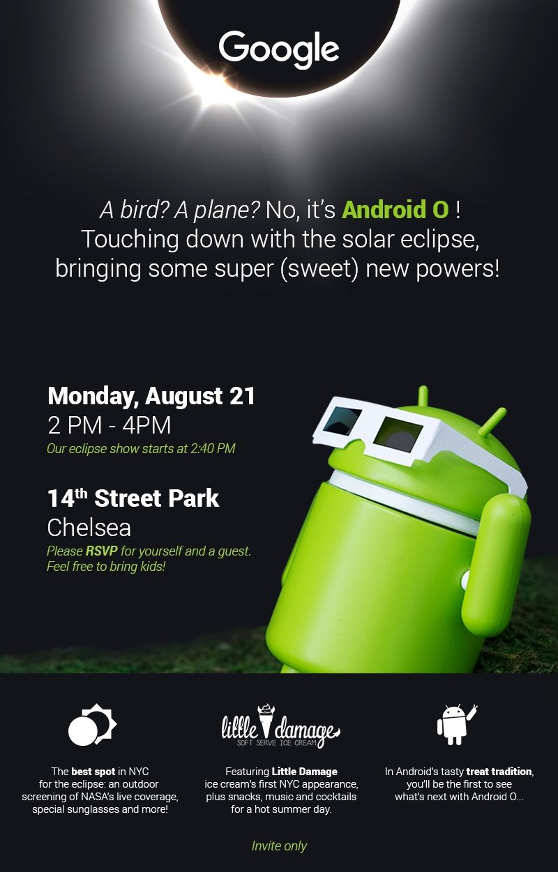 Google anunció de forma bastante creativa, que la nueva versión del sistema operativo Android, Android O, será lanzada el día del eclipse solar total, es decir este lunes 21 de agosto. ¿El motivo para haber seleccionado estas fechas? Cuando el eclipse es total, se ve una rueda de fuego alrededor de la luna, lo cual parece una “O”. Claramente Google no iba a desaprovechar esta oportunidad de mercadeo para lanzar el software. El lanzamiento se hará en vivo y será transmitido por streamign desde la ciudad de Nueva York, a las 2:40 p.m. hora local. Para ver la transmisión puedes dirigirte a la página android.com/eclipse.