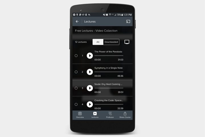 La aplicación Great Courses te permite descargar o transmitir cursos, y es compatible con Chromecast. Las conferencias se hacen profesionalmente y se presentan con claridad, con ayudas visuales cuando sea necesario. Si bien la aplicación en sí es gratuita, tendrás que pagar por cursos individuales. Sin embargo, hay una versión de prueba gratuita y los cursos salen a la venta de vez en cuando. Además, tu probablemente tu teléfono pesa mucho menos que un libro de texto.