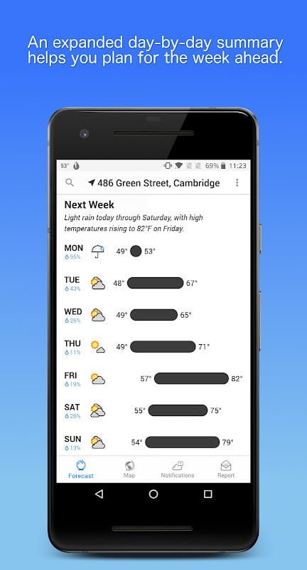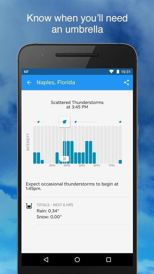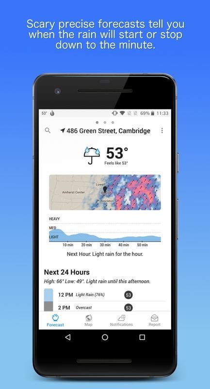 AccuWeather es de las mejores, no solo por su facilidad de uso sino también por lo completa que es. Incluye algo llamado MinuteCast, con lo que AccuWeather intenta brindarte un resumen minuto a minuto de las condiciones climatológicas de las próximas dos horas. También hay pronósticos por hora para hasta tres días y un pronóstico por día para 15 días.