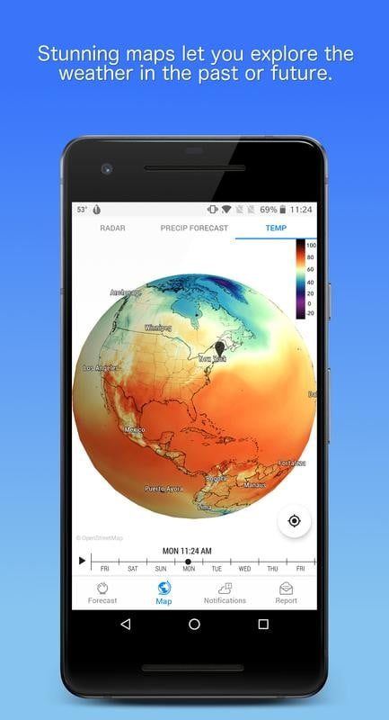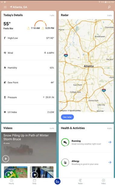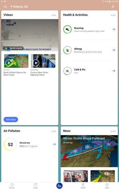 También ofrece una opción de pantalla de inicio dinámica que cambia según la hora, ubicación y clima y te dice si hace buen tiempo para una variedad de actividades al aire libre. Sus mapas meteorológicos se actualizan rápido e incluye información de rayos.