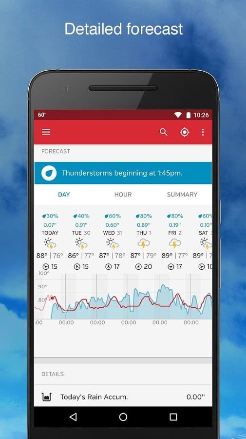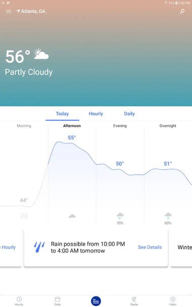 ¿Cómo podríamos no incluir la aplicación del Weather Channel? Es gratuita, completa y tiene prácticamente todo lo que necesitas para vigilar los cielos. Cambia automáticamente dependiendo de tu ubicación y proporciona el clima actual más el clima por horas para los dos días siguientes, además de pronósticos para hasta 15 días.