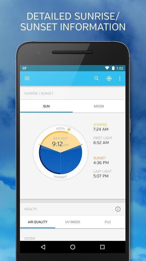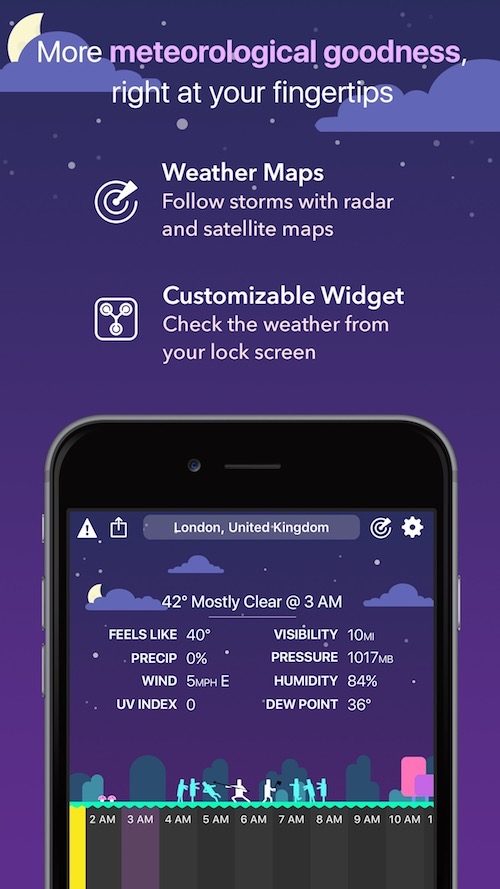 También ofrece una opción de pantalla de inicio dinámica que cambia según la hora, ubicación y clima y te dice si hace buen tiempo para una variedad de actividades al aire libre. Sus mapas meteorológicos se actualizan rápido e incluye información de rayos.